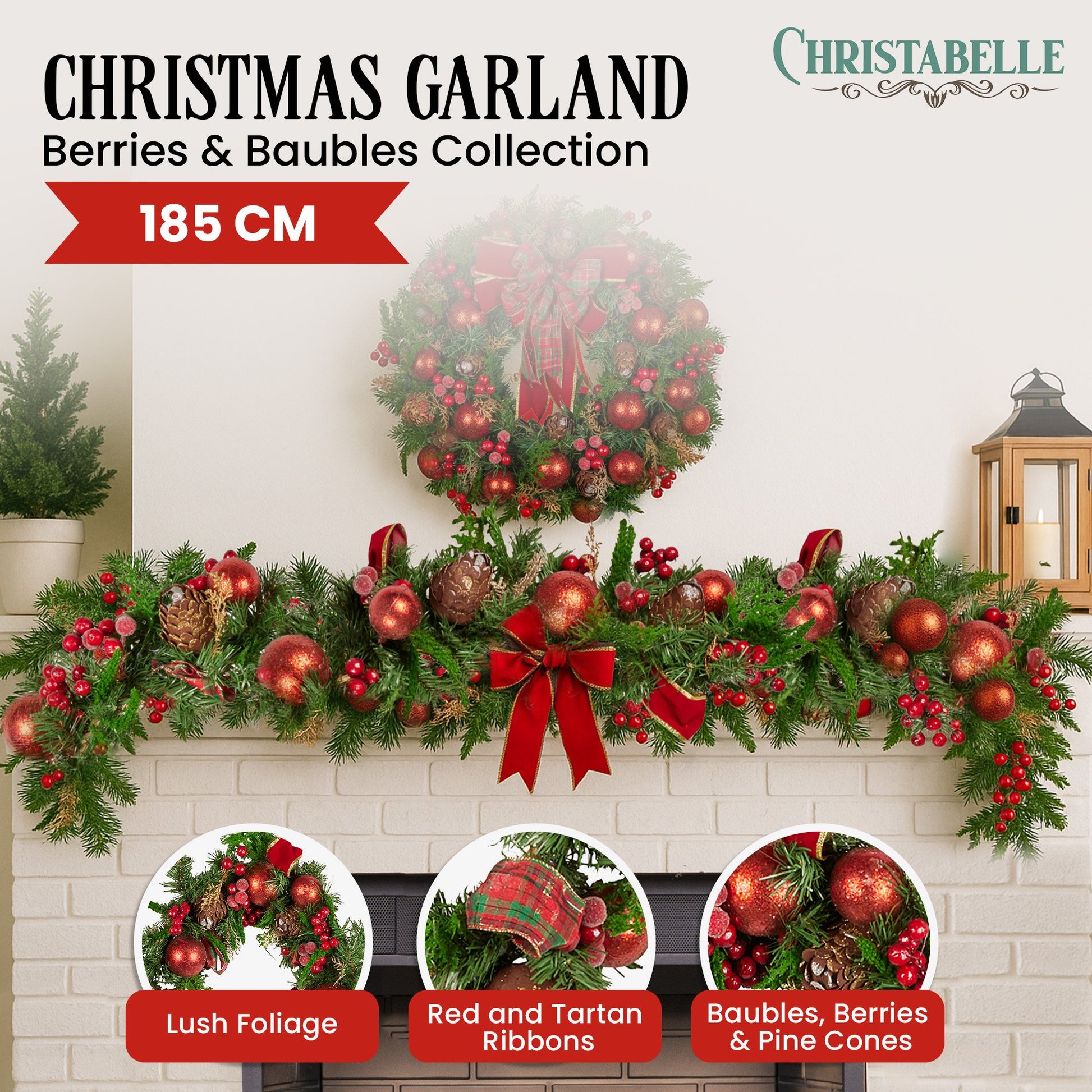 Christabelle 1.85m Christmas Garland with Red Berries Pine Cones Baubles Bows Tree Decoration Ornament