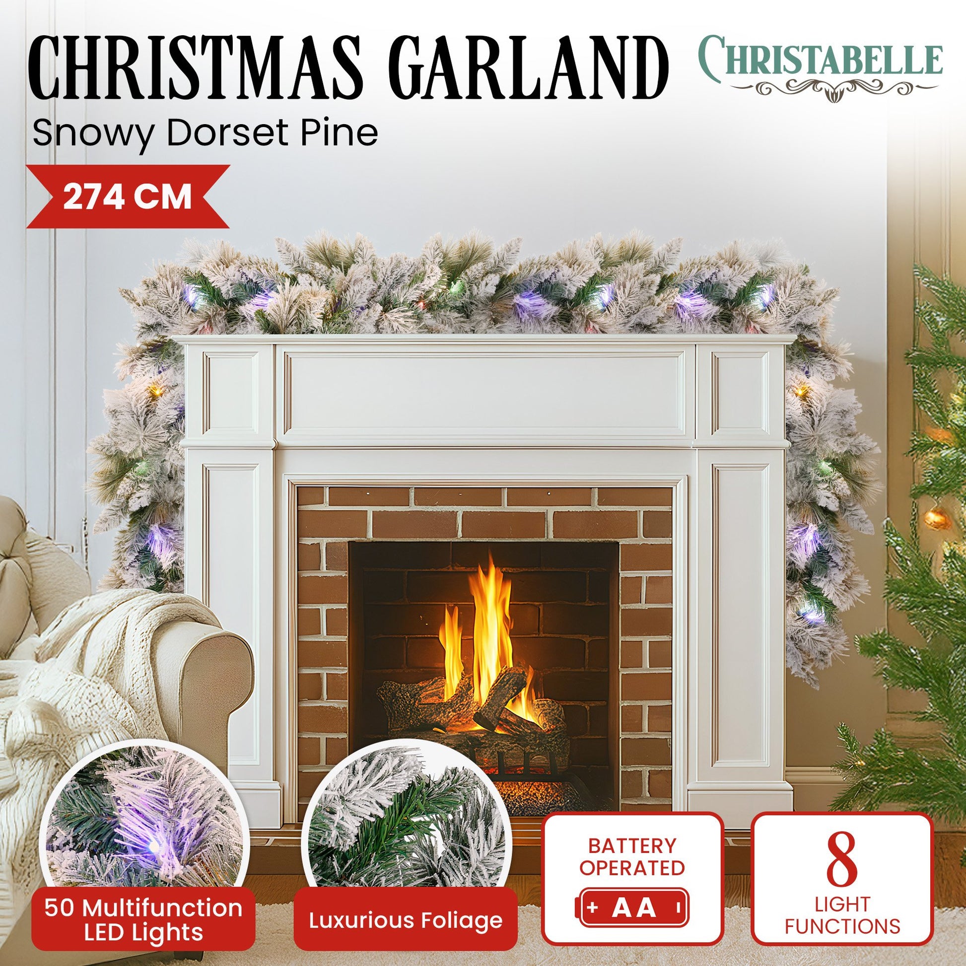 Christabelle 2.7m Snowy Christmas Garland Dorset Pine Pre-Lit with Multi-Function LED Lights Door Decoration
