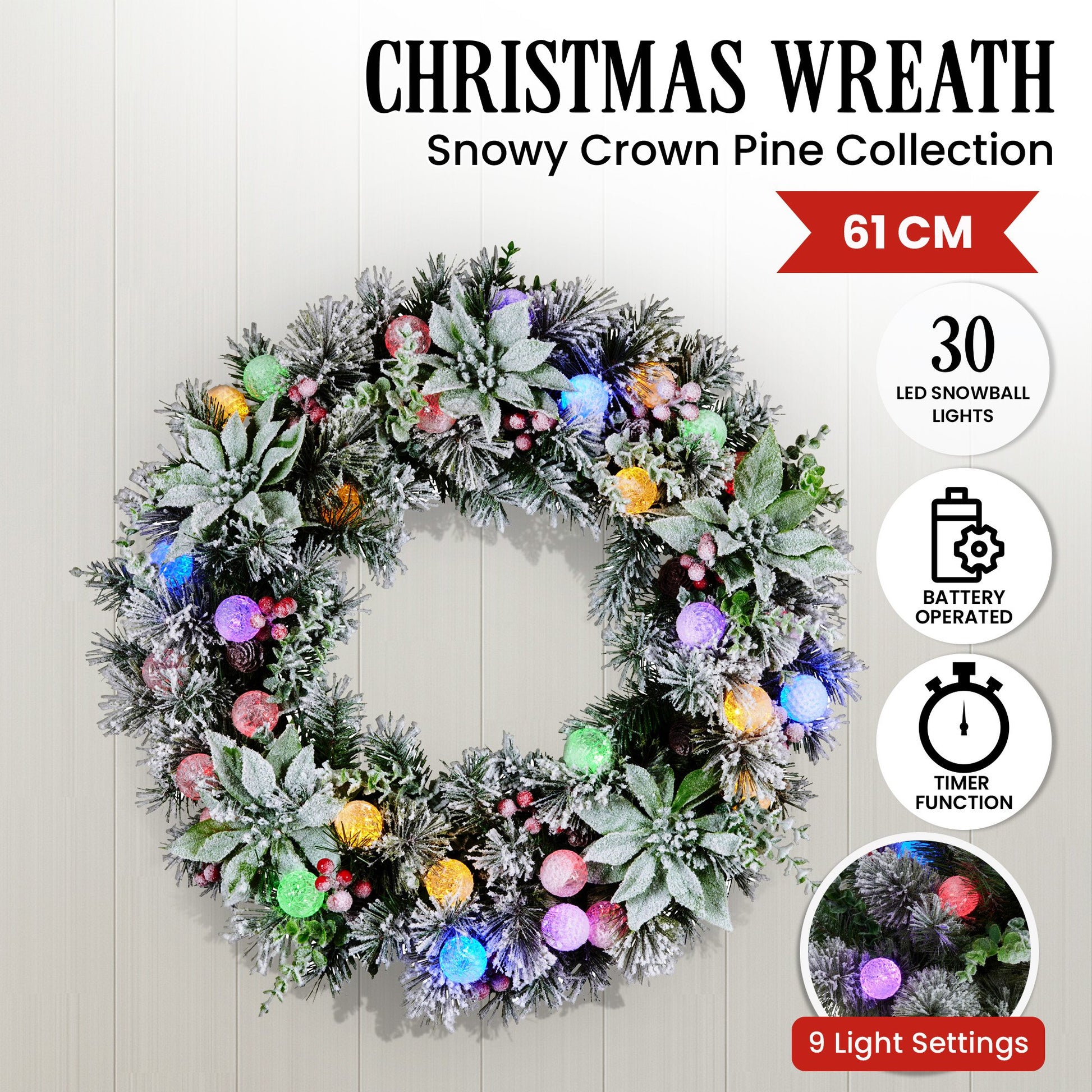 Christabelle 61cm Snowy Christmas Wreath with LED lights on a Crown Pine base, designed to brighten your entry with Christmas charm.