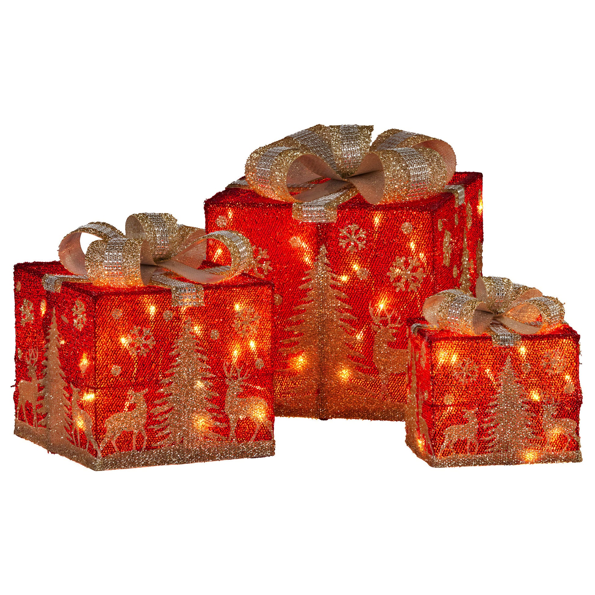 Christabelle Battery Operated Red Christmas Gift Boxes with Lights, Gold Scenery & Gold Bows - Set of 3