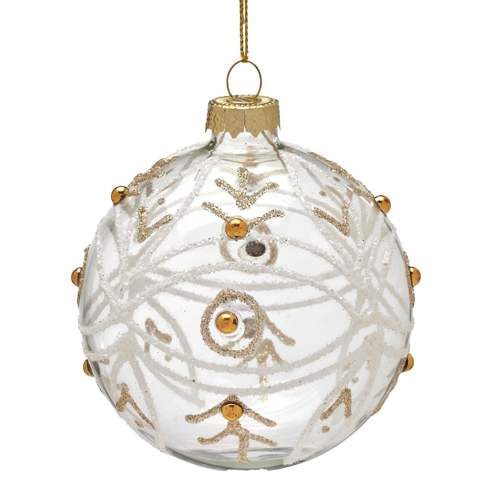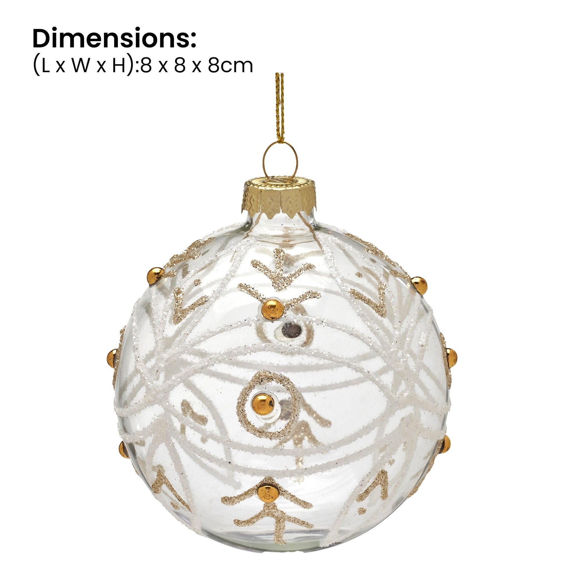 Bring festive sparkle to your tree with this elegant glass bauble. Made from clear glass, it’s adorned with gold pearls and swirls of white and gold glitter for a luxurious touch. Measuring 8cm, each bauble adds shimmer and detail to your décor. Sold in packs of 6, they’re perfect for sharing or creating a coordinated look.