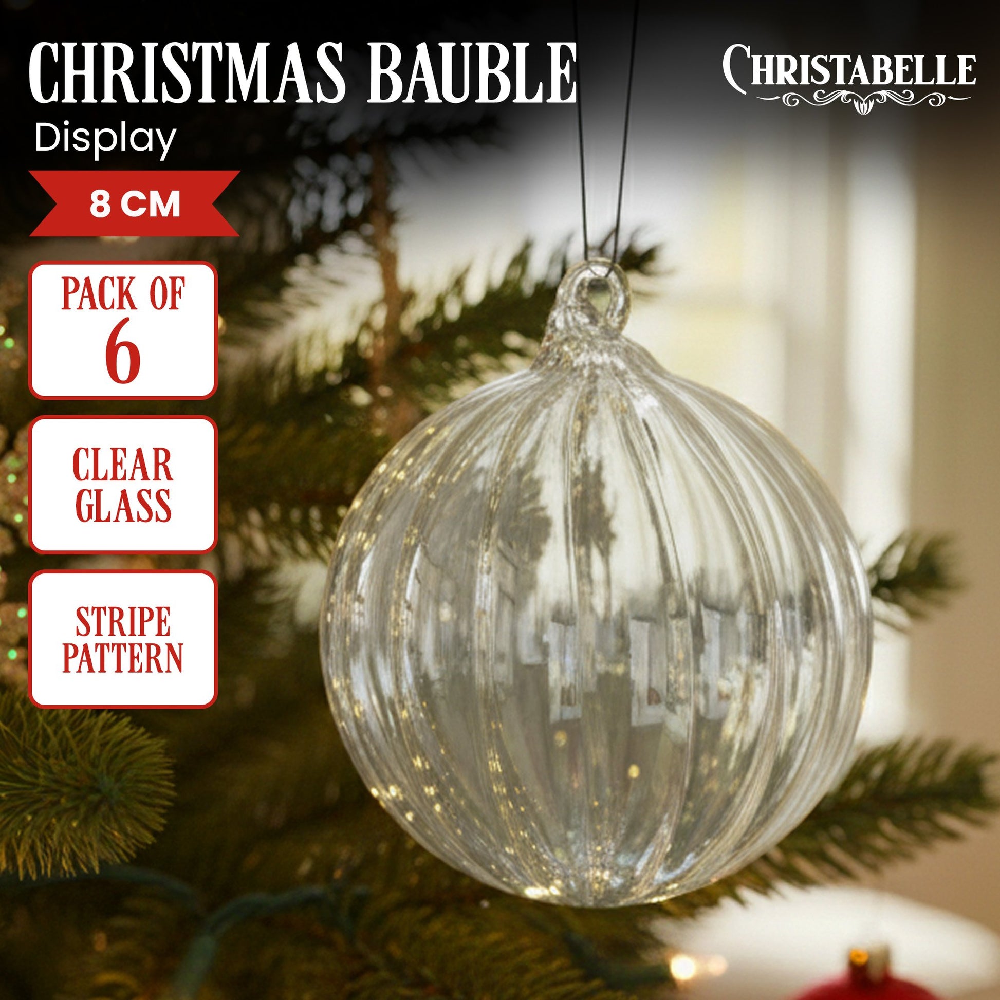 A touch of transparency goes a long way. This pack of six 8cm baubles is crafted from clear glass and features a delicate stripe pattern, adding an airy, elegant finish to your Christmas tree or festive table centrepiece.