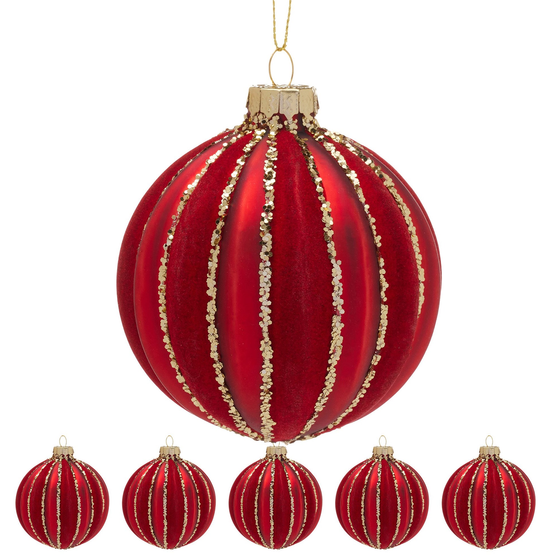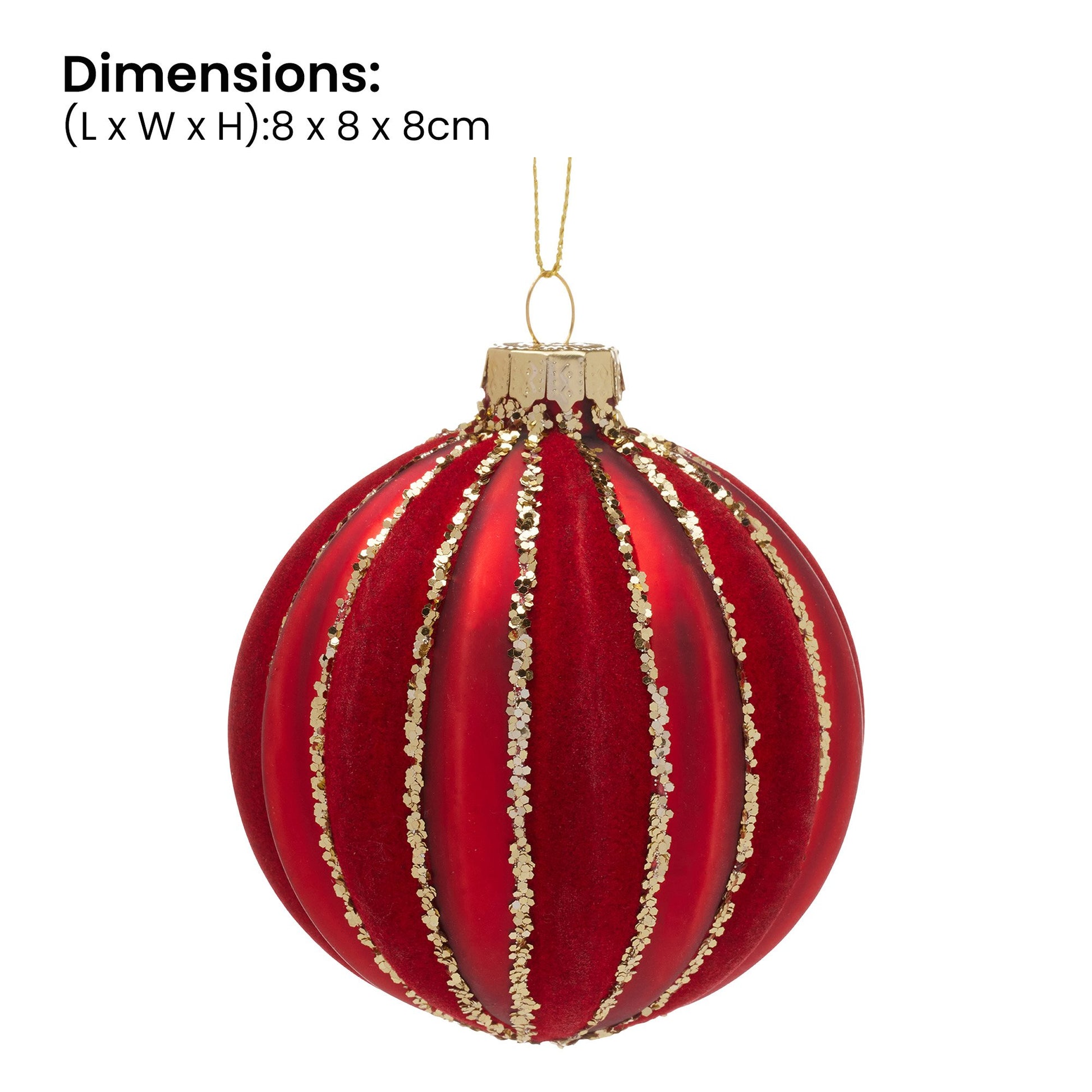 Add a regal glow to your festive décor. This set of six 8cm glass baubles showcases a rich red hue with elegant gold glitter stripes, perfect for bringing warmth, texture and timeless sparkle to your Christmas tree or display.