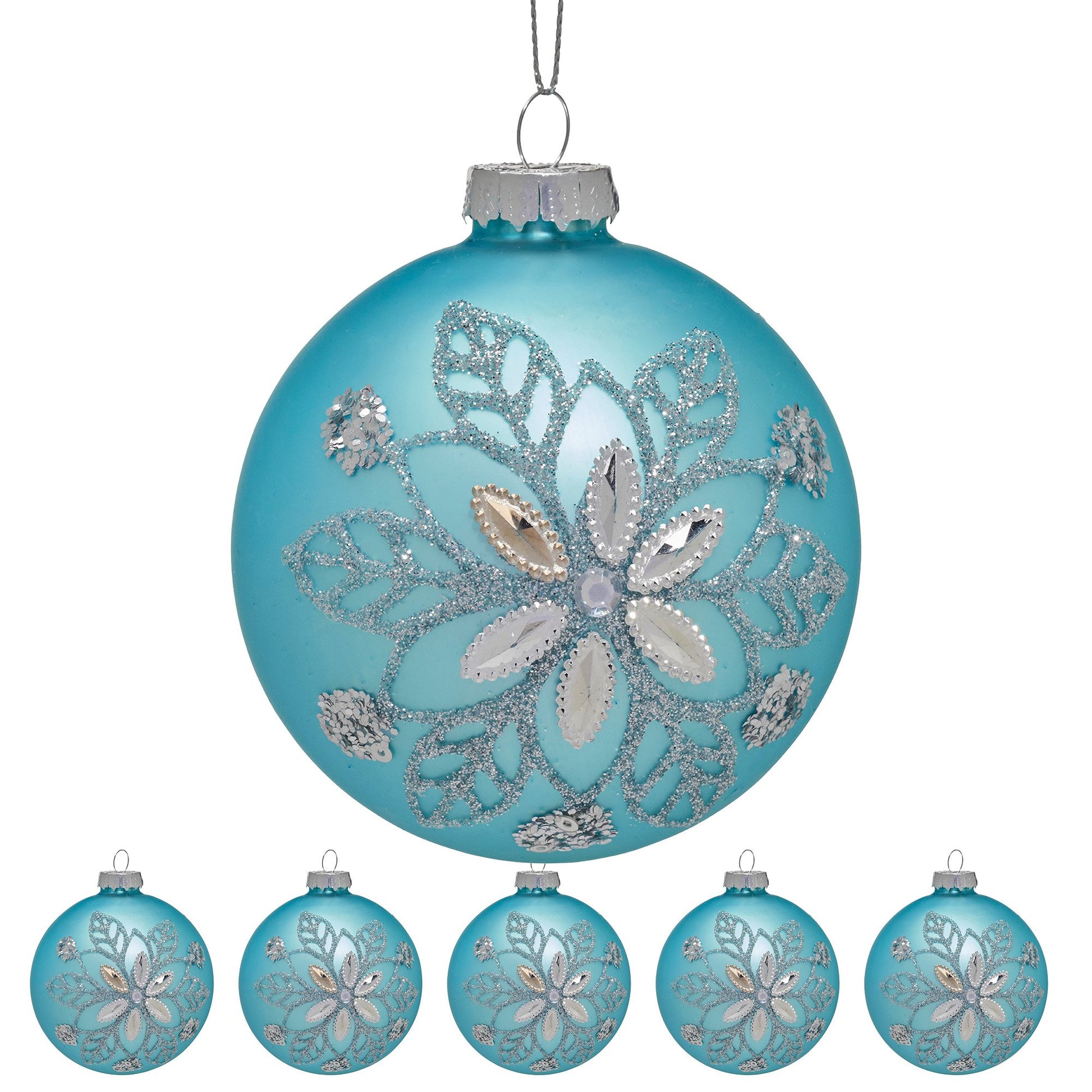 Christabelle Box of 6 Teal Glass Baubles with Snowflake Pattern & Central Jewel
