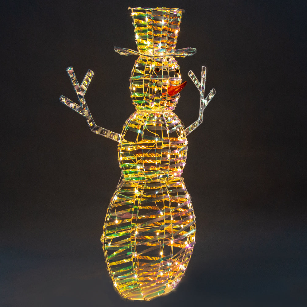 This amazing snowman is designed to look incredible at night. The irridescent strips covering the body reflect and refract the built in twinkle lights, creating a dazzling play of colors that will capture the attention of everyone passing by. This beautiful Christmas display cant be missed for your outdoor set up.