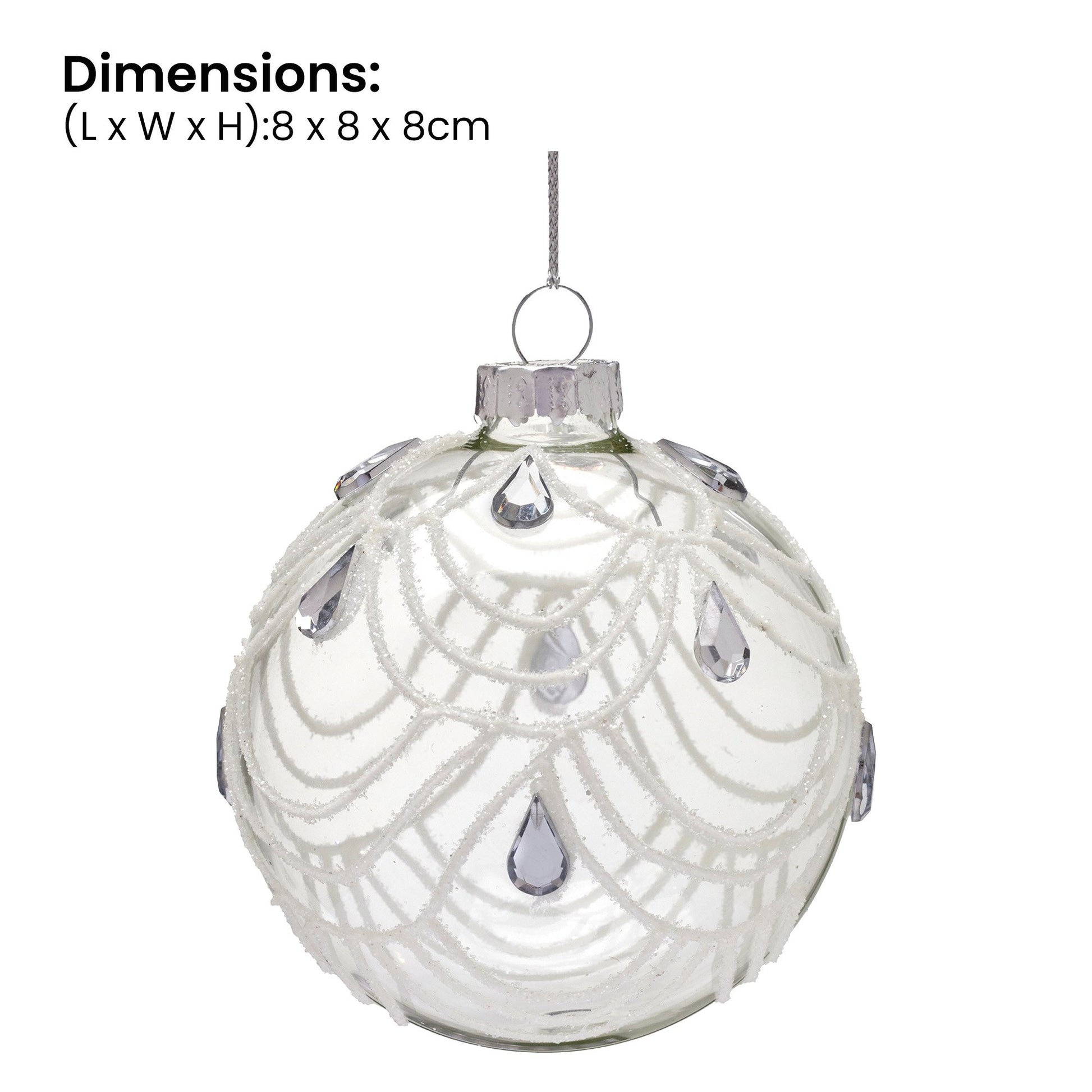 Bring a sparkle of elegance to your Christmas tree with these clear glass baubles. Decorated with delicate white glitter swirls and shimmering teardrop gem accents, they add a sophisticated glow to any festive setting. Each bauble measures 8cm in diameter and comes in a handy pack of 6, perfect for gifting or creating a coordinated look.