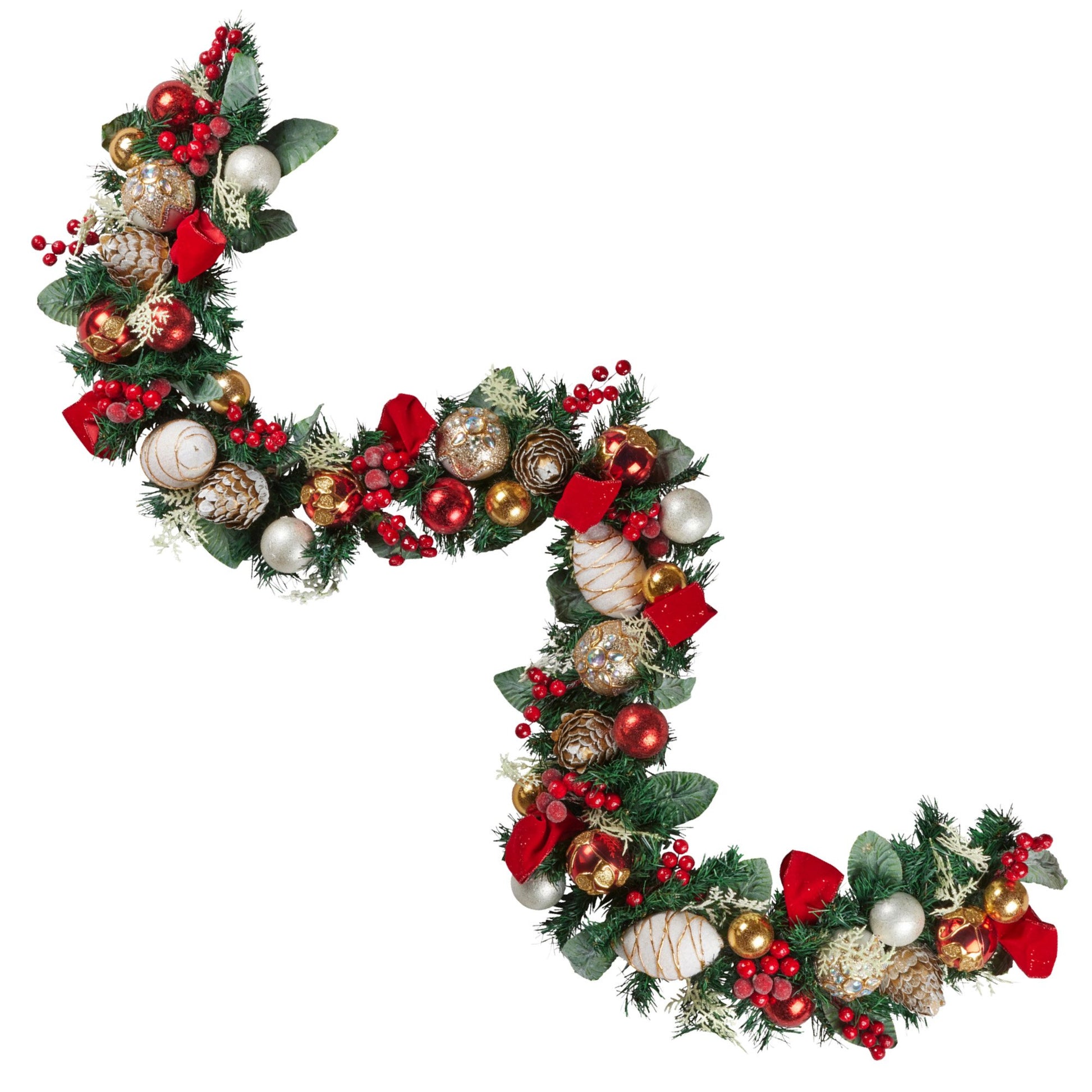 Featuring realistic foliage, this beautiful floral garland infuses your home with festive cheer. Decorated with baubles, berries, and ribbons in traditional Christmas colours, this garland is simple to assemble and brings a timeless touch of elegance to your seasonal holiday.