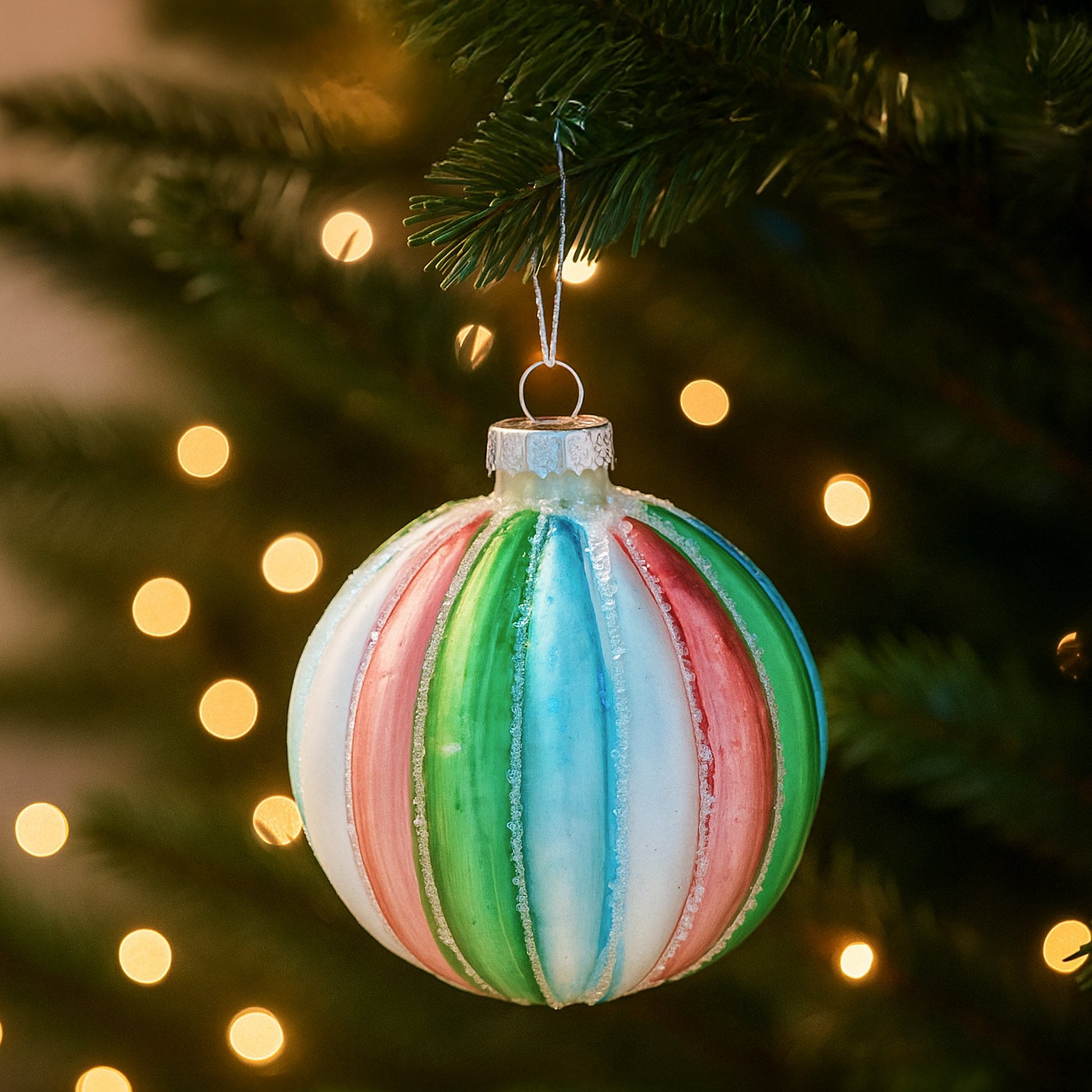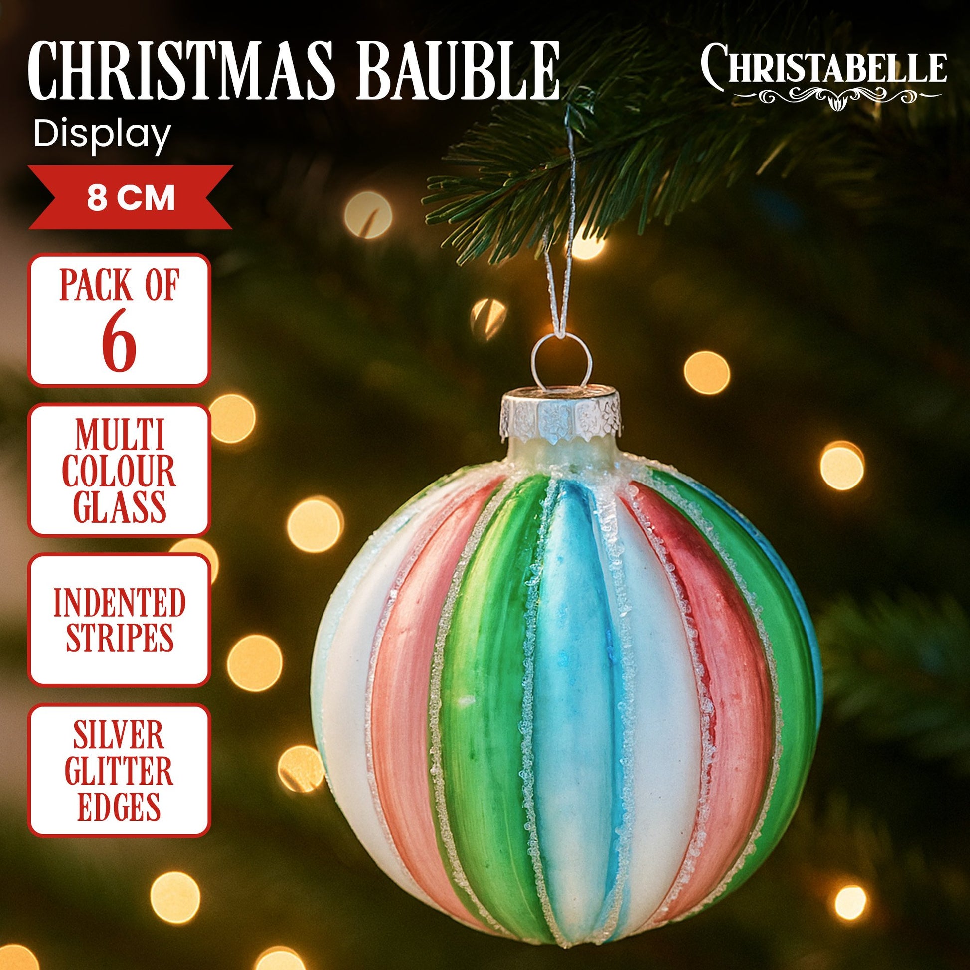 Festive colour meets timeless style with this 8cm glass bauble. Featuring bold multi-colour stripes outlined in silver glitter, the indented design adds texture and depth that sparkle under the lights. A standout addition to your décor, these ornaments come in packs of 6 so you can share or create a vibrant coordinated look on your tree.