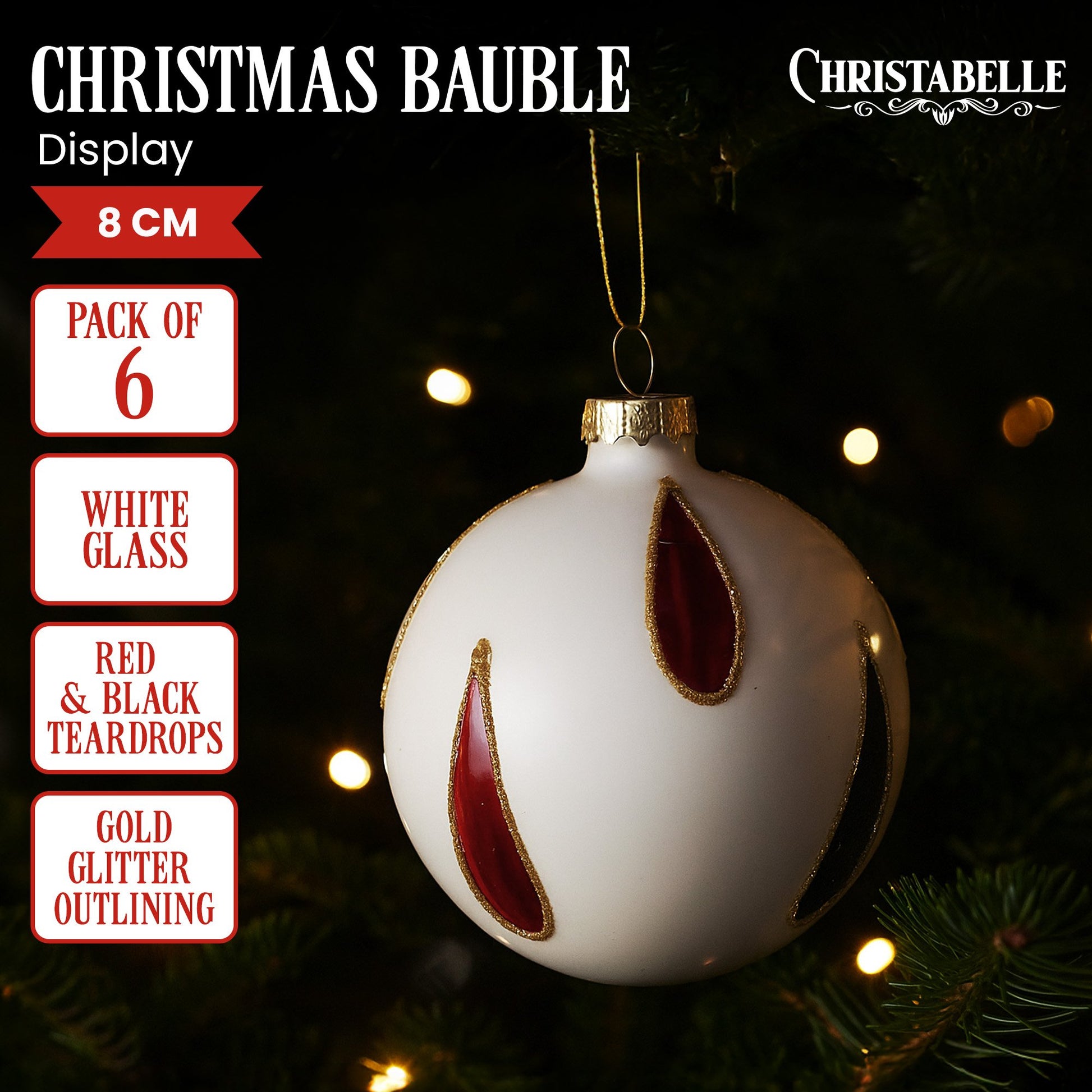 Christabelle White Glass Baubles 6Pcs with Red & Black Teardrops Balls Christmas Tree Decoration Ornament