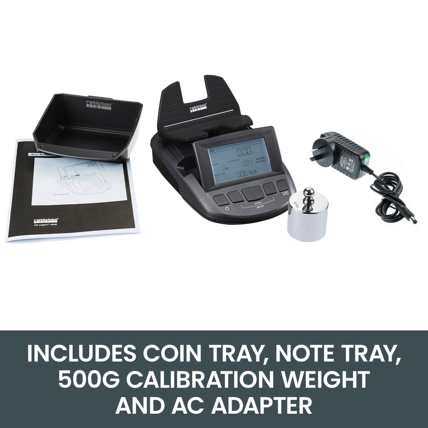Count your cash in seconds with this smart electronic money scale. With a bill holder, coin tray, and a 500g calibration weight, it has everything you need for quick and accurate accounting.