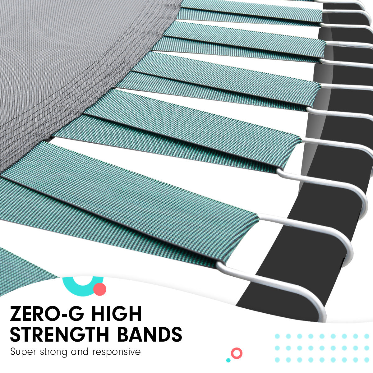 Springless design: Rather than using steel springs, this innovative design uses super-responsive, wide elastic straps all the way around the mat to provide the bounce in a safe springless jumping area.