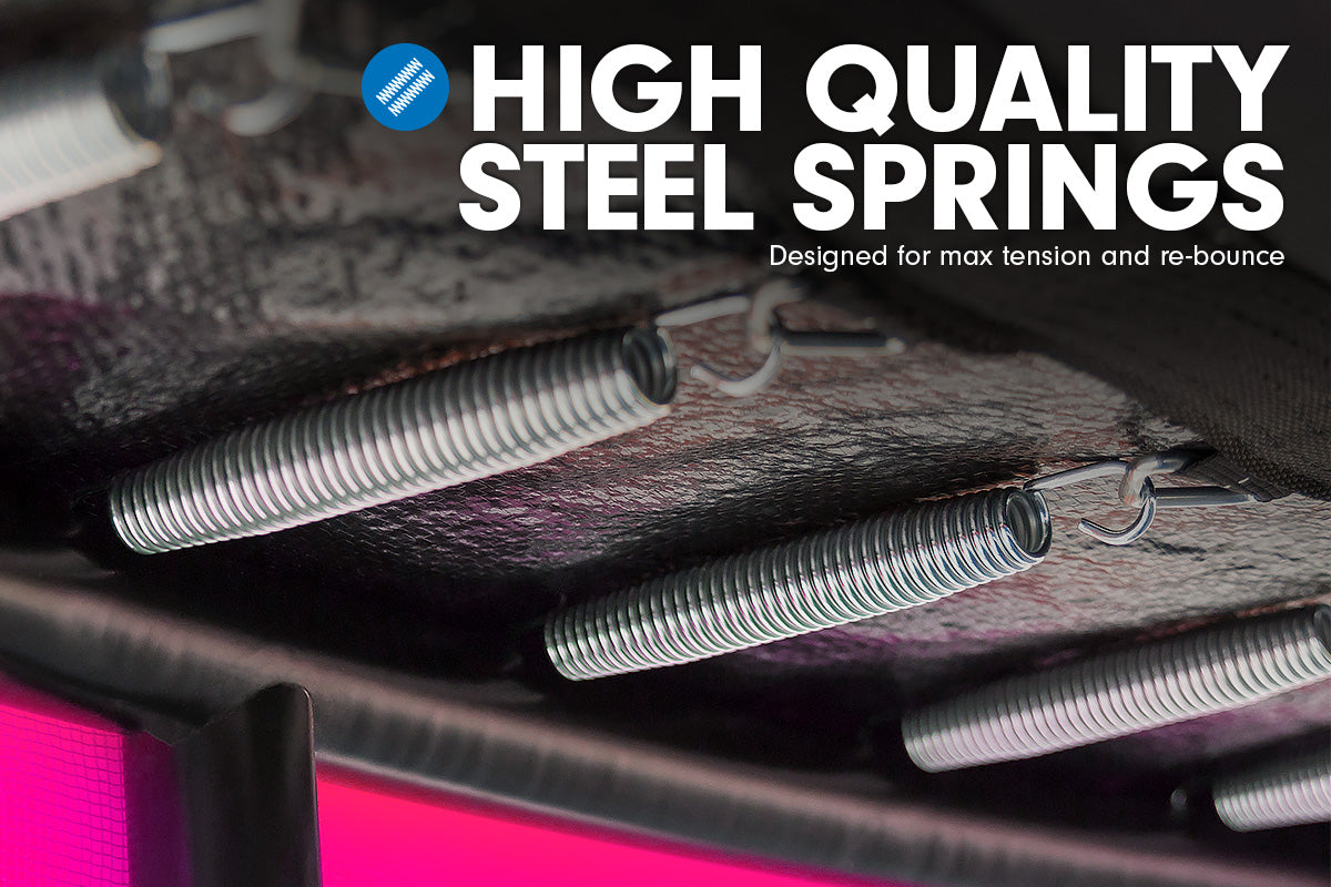 This trampoline uses linked legs for superior stability and structure of the legs also minimises the tendency for legs to dig into the ground. Legs also feature re-enforced joint bars to enhance strength and stability.