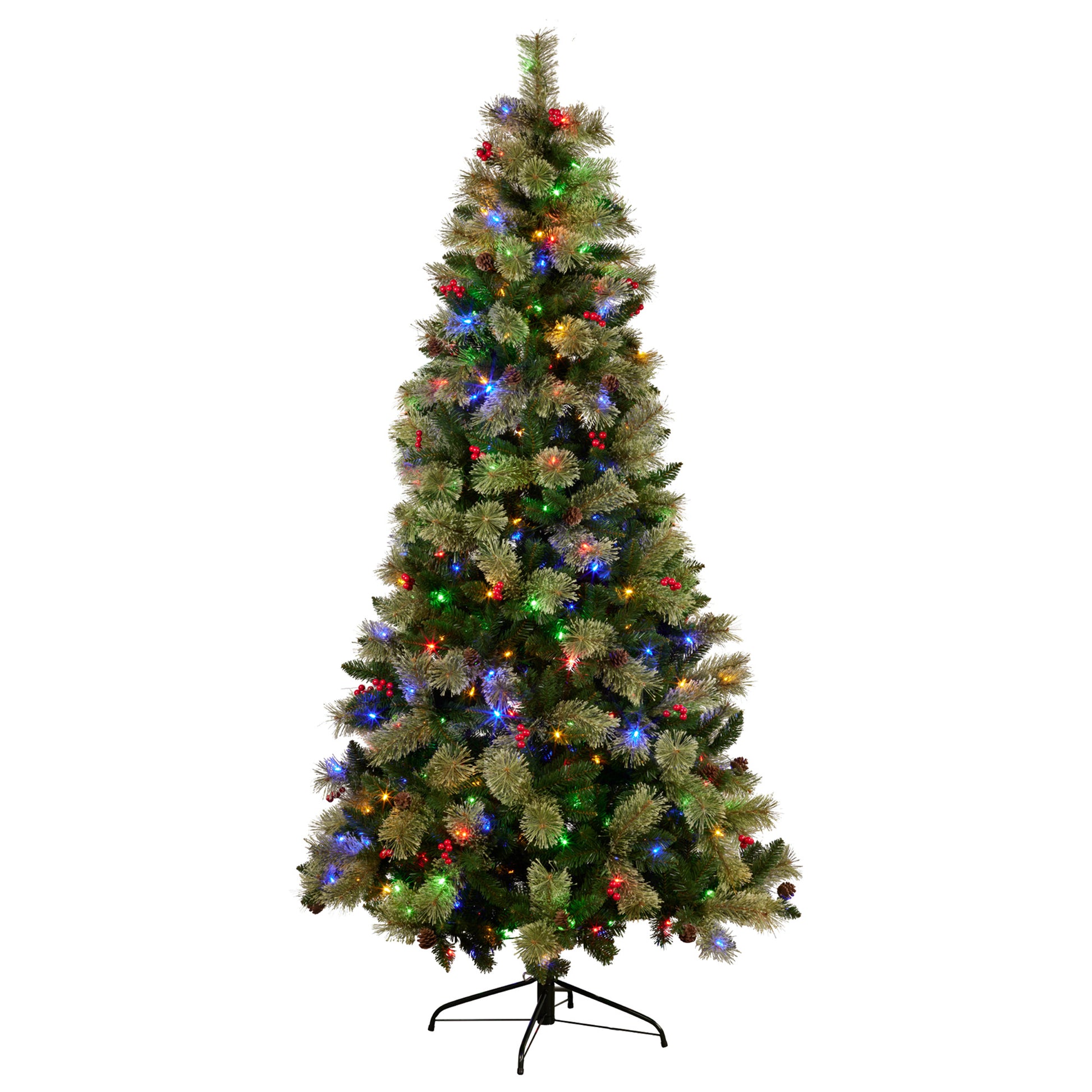 Dreaming of a vibrant Christmas tree for your holiday decor? This 7.5ft (229cm) pick from the Bristle Berry collection is a fantastic choice! It combines dark and light pine branches with brush foliage decorated with bright red berries and pine cones. Plus, you can change the LED lights from white to colourful or a blend of both. Its the ultimate centrepiece for your holiday setting!