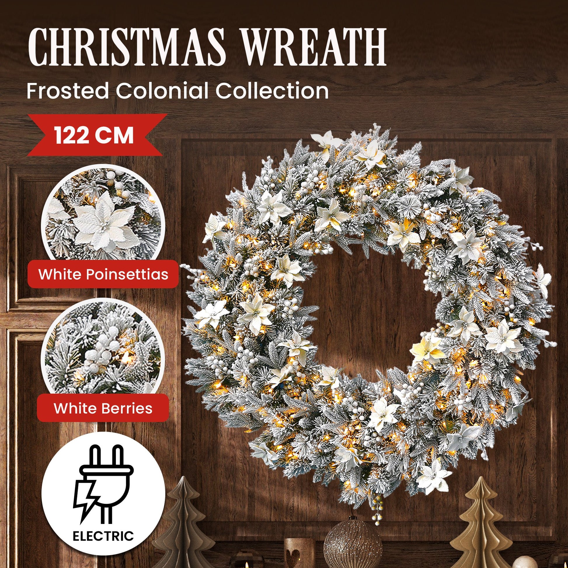 Transform your space into a delightful festive sanctuary with the Frosted Colonial Christmas Wreath from National Tree Company. At an impressive 122cm in diameter, its a true attention-grabber, commanding notice with its large size and captivating aura.