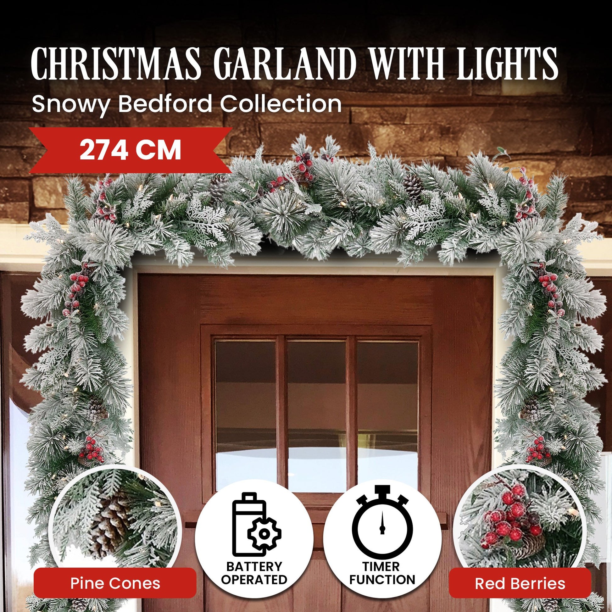 Bring this stunning Christmas garland to accent your decor and your home will surely exude winter wonderland vibes. Coming from the Snowy Bedford collection, this beautiful battery-operated garland has 70 cosy warm white LED lights for enchanting illumination.