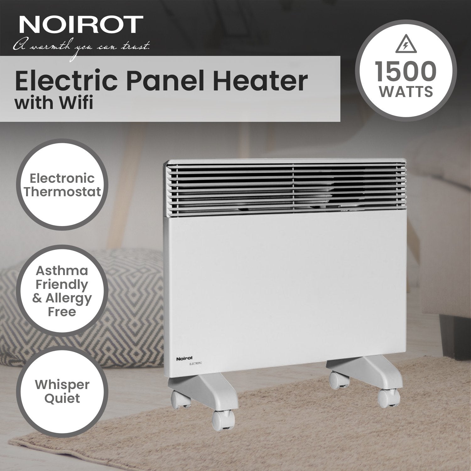 The Noirot Spot Plus 1500W Electric Panel Heater brings cosy warmth to any living room, lounge or bedroom. It's safe, silent and energy-efficient - a great choice for busy homes and families. Plus, with an integrated Wi-Fi timer, staying warm has never been more convenient.