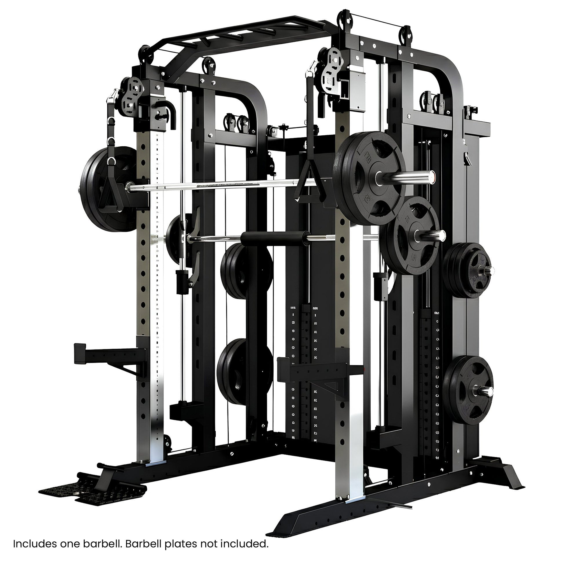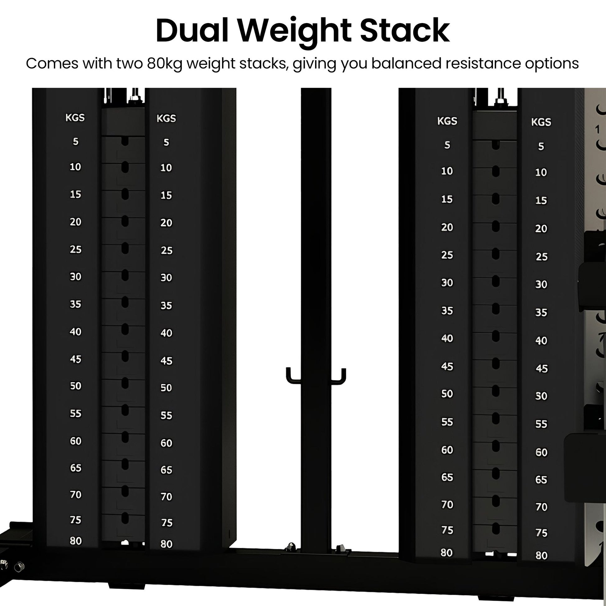 Transform your fitness routine with a multi-function Smith machine that delivers the ultimate workout flexibility. Built on a heavy-duty steel frame, it supports up to 150kg of user weight and includes dual 80kg weight stacks with plastic sleeves. Train with the integrated power and squat rack or switch to cable pulley exercises for dynamic strength conditioning.