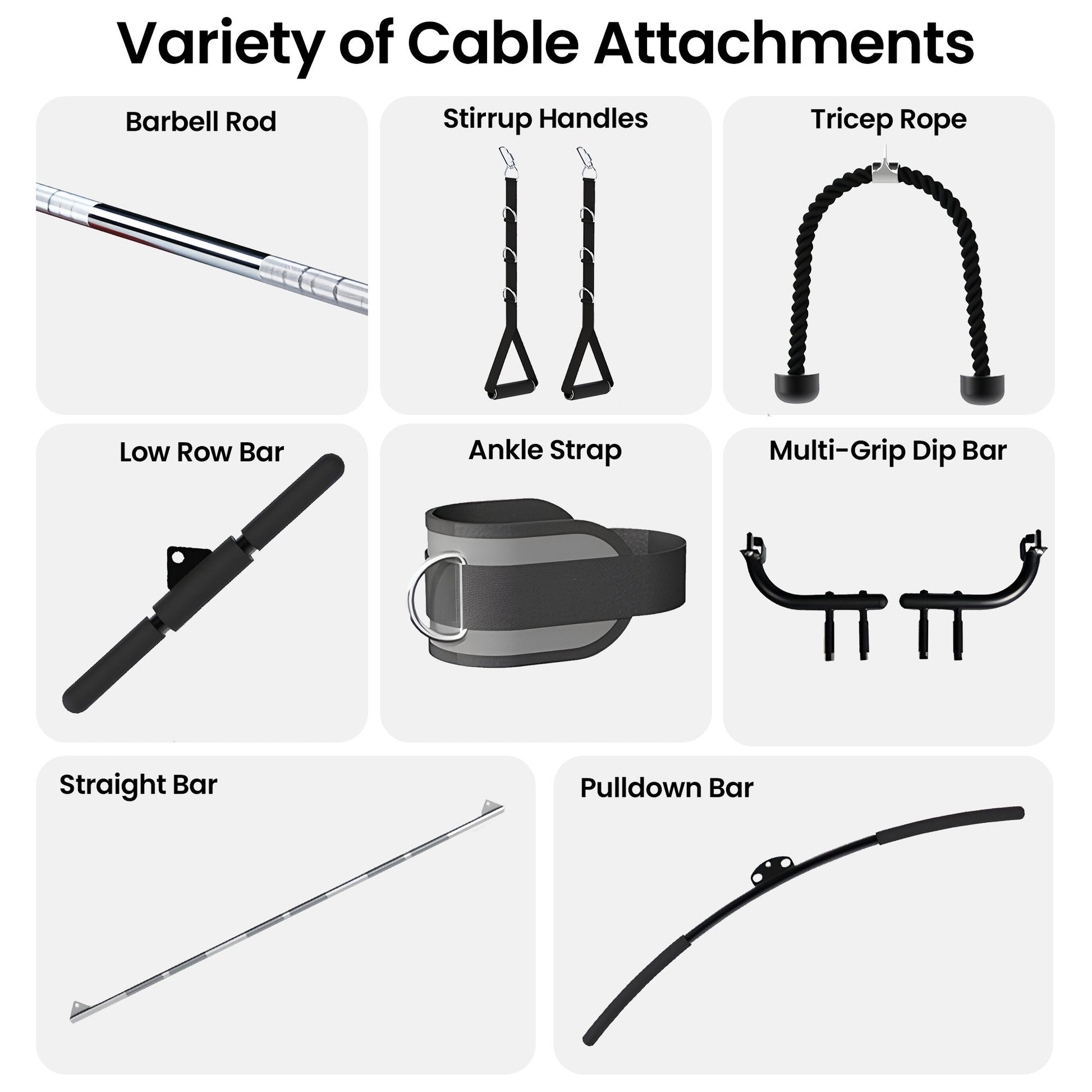 - Functions: Squat, Lat Pull Down, Dips, Chin Up, Cable Crossover, Lower/Mid/High Position Pull, Rower and T-Bar Rower