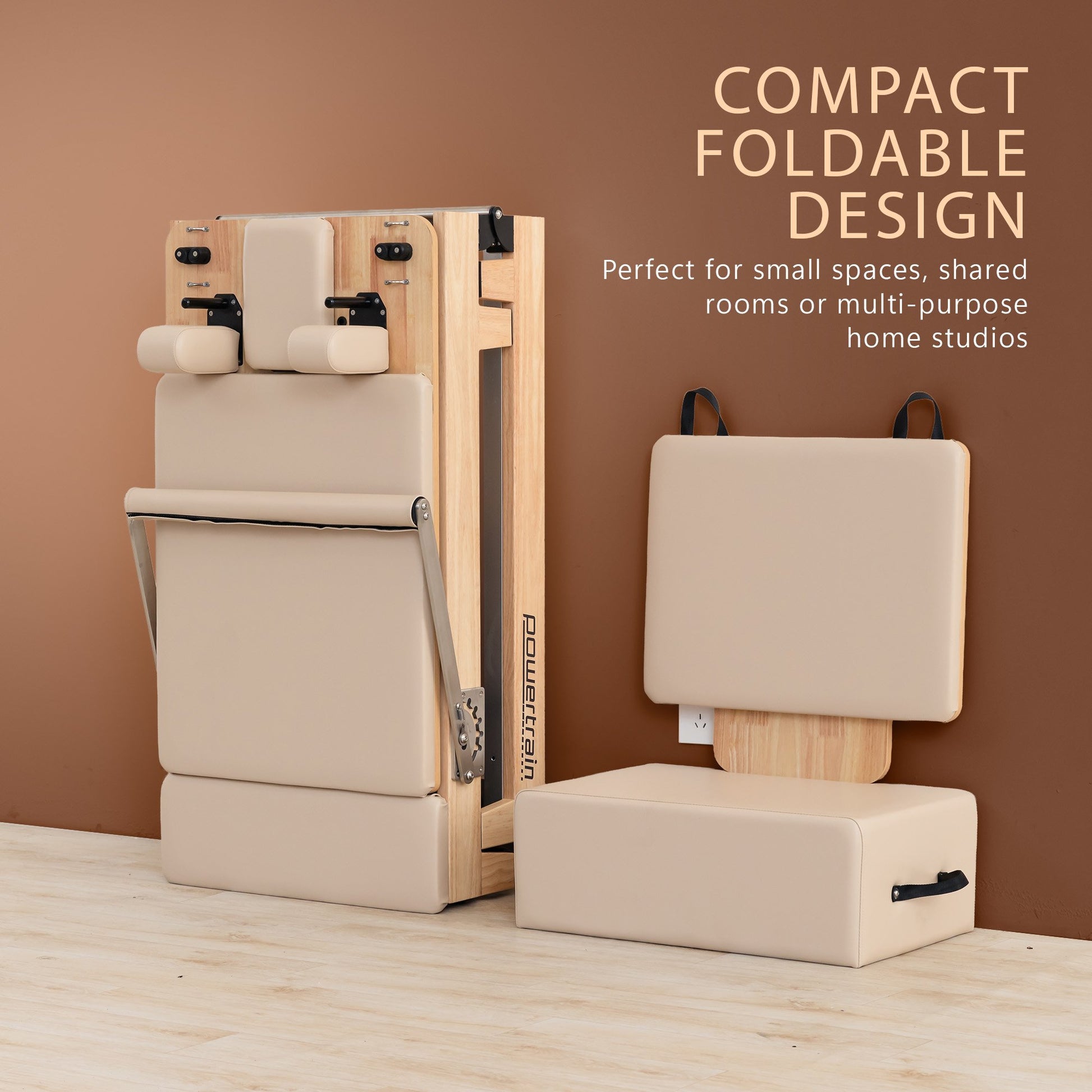 Powertrain Fitness Selina Folding Wooden Pilates Reformer in Beige with Jumpboard & Sitting Box Oak Home Gym Equipment