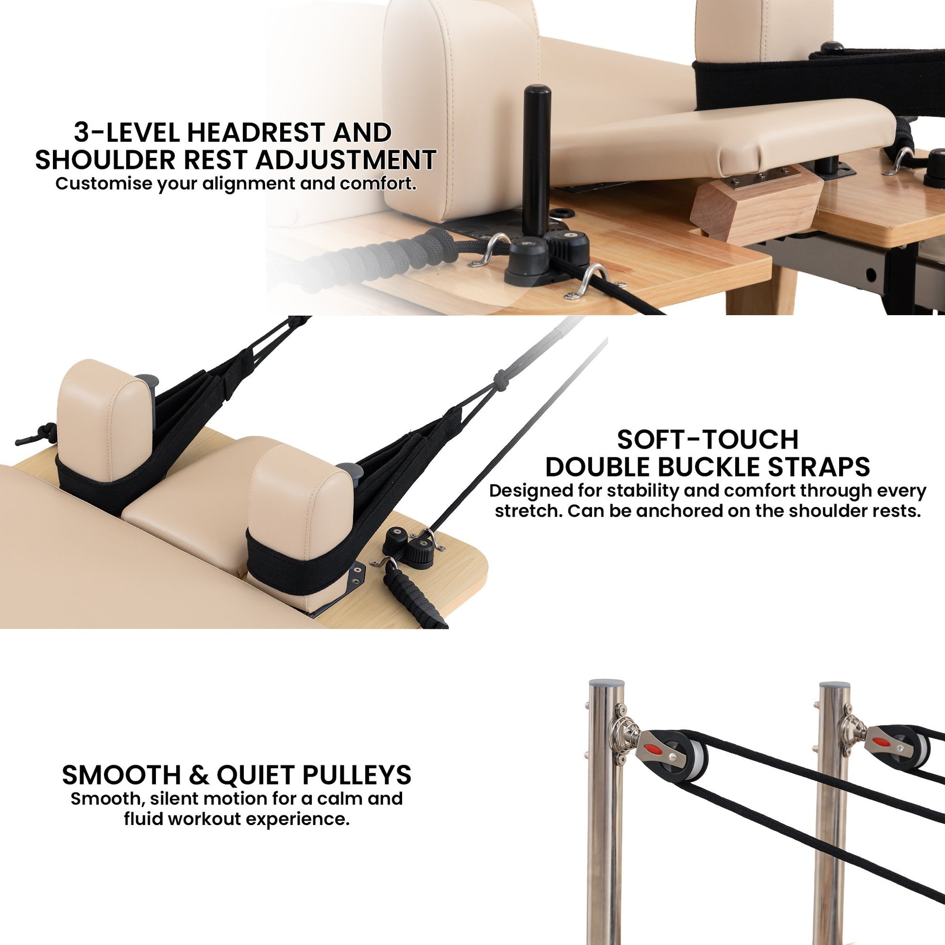 The headrest and shoulder rest feature three-level adjustments to support proper alignment throughout your workout. Whether you're stretching, toning or building strength, this reformer delivers a full-body challenge with comfort and control. Perfect for dedicated Pilates lovers seeking a premium experience without sacrificing space or silence in their home setup.