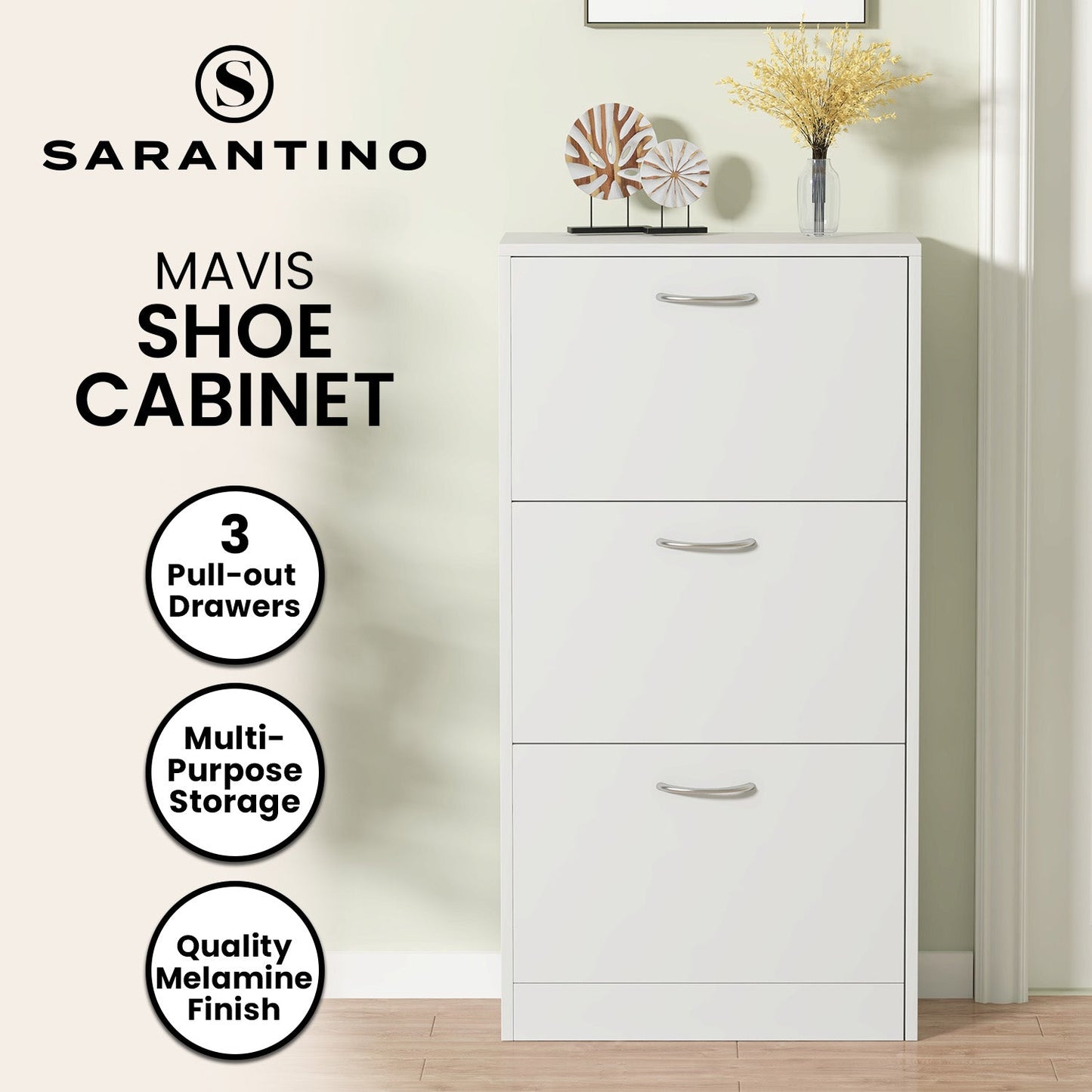 The Sarantino Mavis Shoe Cabinet is a versatile addition to any home. This contemporary shoe storage solution features a high-quality melamine finish, combining style with durability. Its sturdy construction boasts three pull-out drawers, providing ample space for your footwear or other essentials. Its smooth surface makes for easy maintenance. Enhance your home organisation and aesthetics with the Sarantino Mavis Shoe Cabinet.